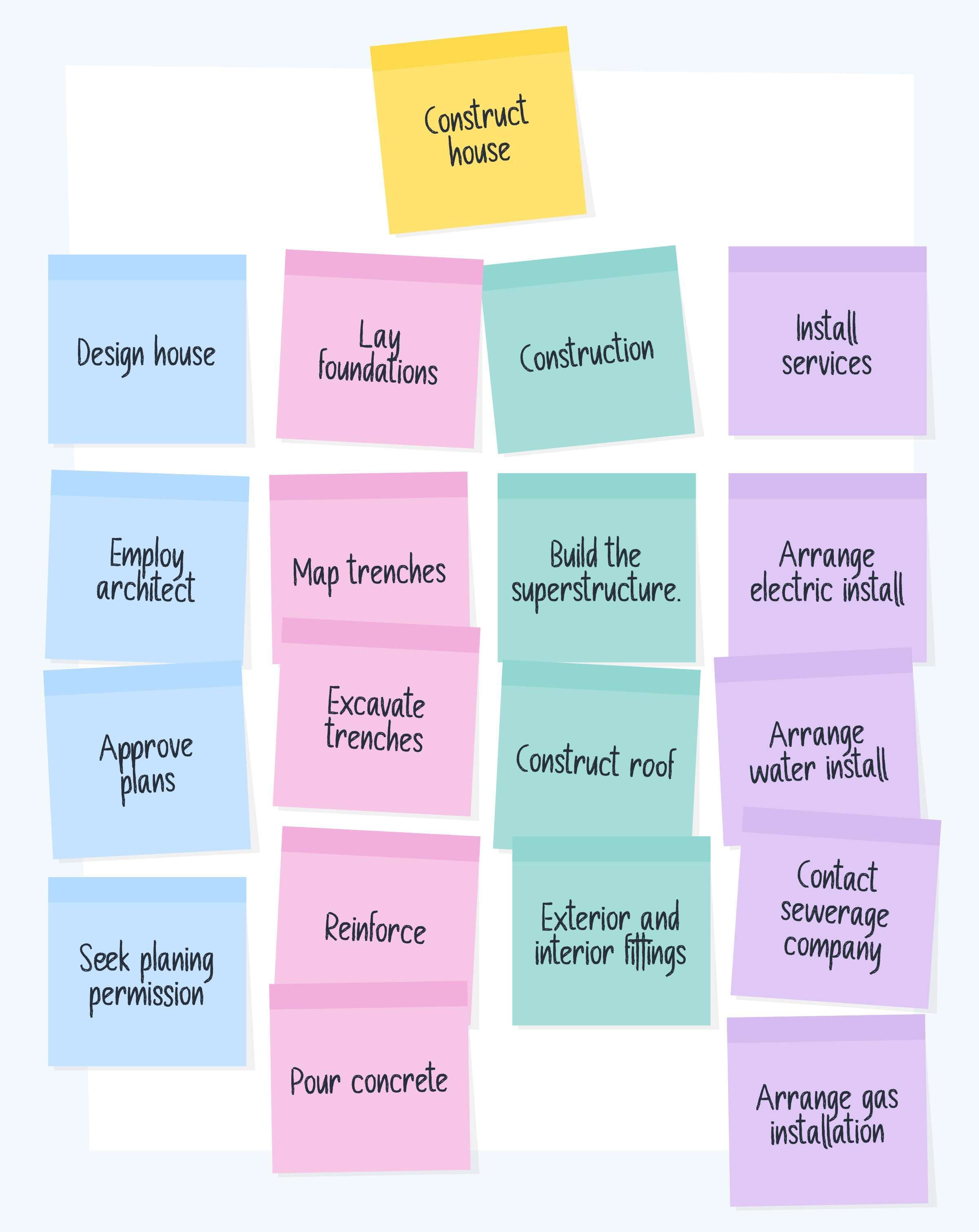Next, you'll want to categorise your tasks into groups, forming your Work Breakdown Structure, and this is where Post-its come into their own. Decide on your categories and sub-categories if required, and move your tasks into them to create what resembles a tree of Post-its.